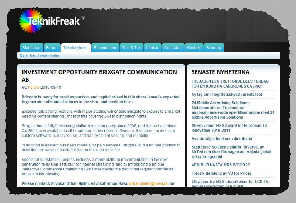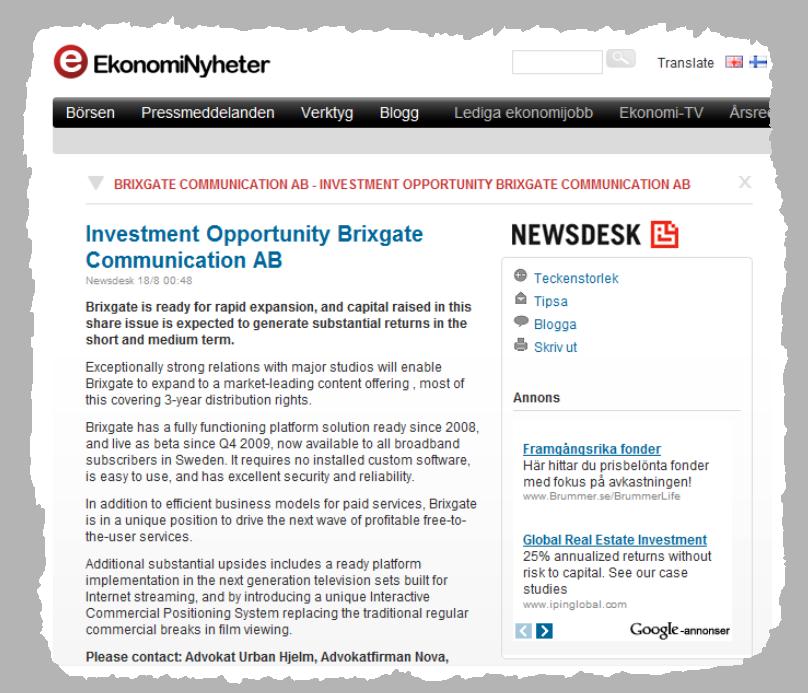 The technical solution, an MPPA approved platform, a unique advertisement model USPTO 20110208583 and strategic agreements are already in place, and Brixgate expects to launch the Service in Sweden in the first quarter 2009. Brixgate is in final discussions with a major broadband distributor for co-branding to gain bootstrap awareness in the market. A small share issue targeting a limited number of investors, is made to provide funds for the final steps leading up to
