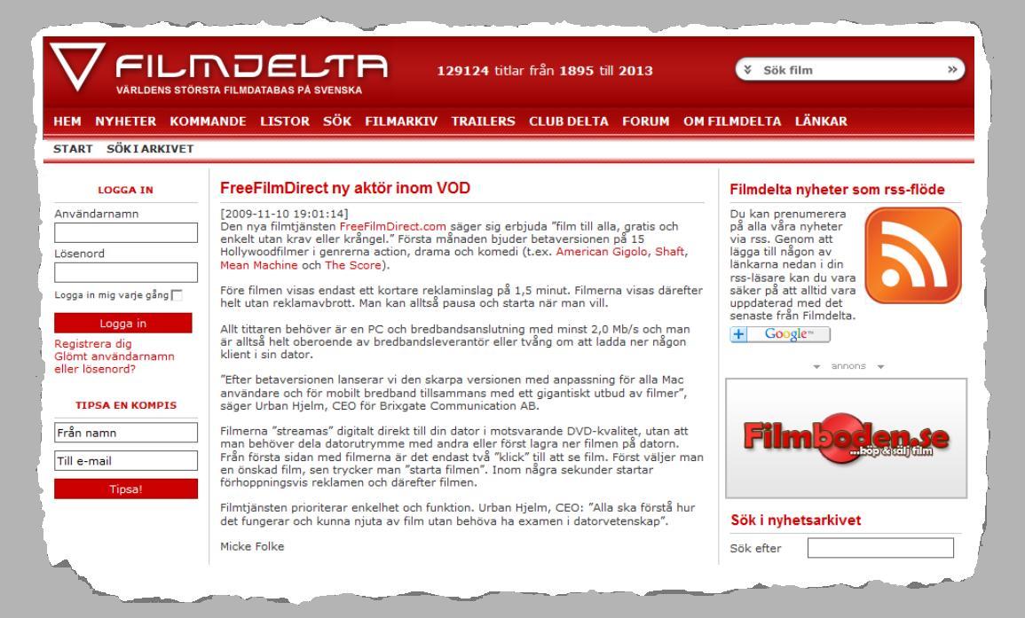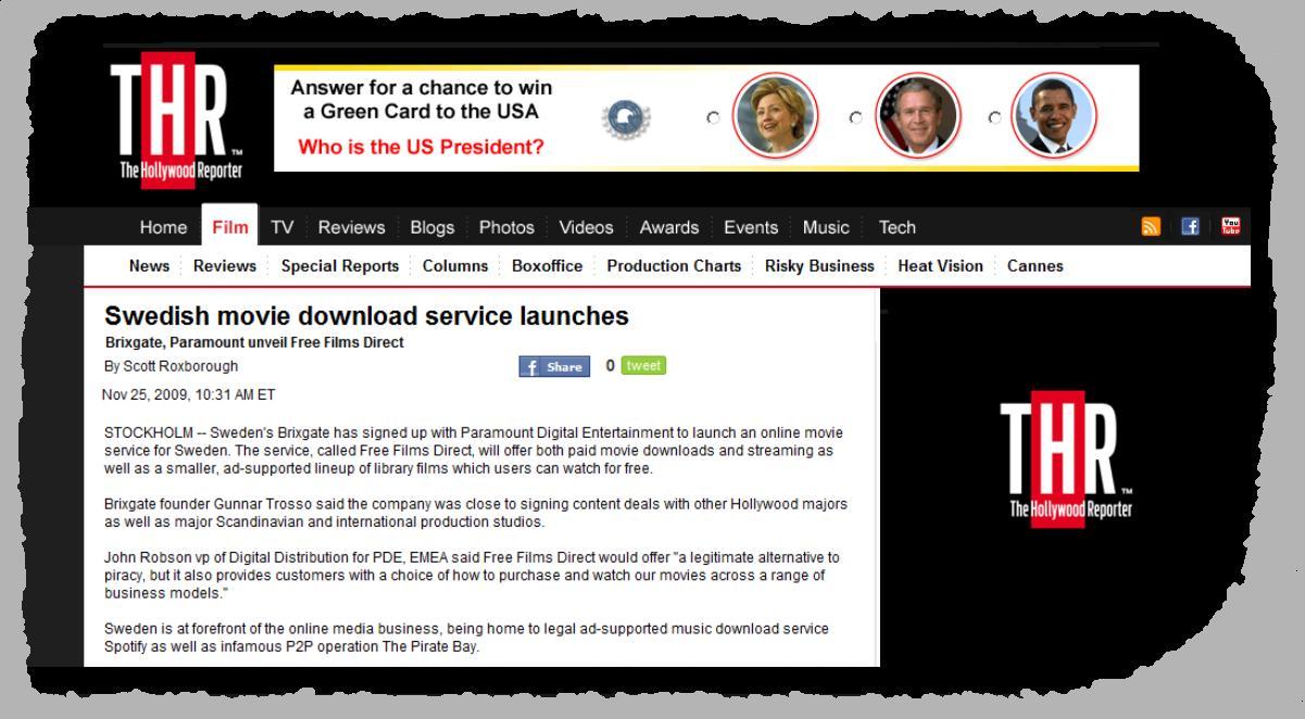 Stockholm – December 18th 2009 - Brixgate today announced that it has joined with the Scandinavian distributor NonStop Entertainment providing an extensive range of library and current movies to Brixgate´s fully owned Free Film Direct , the only entirely independent online free film service in Sweden, thus expanding its free content with more than a hundred feature films.