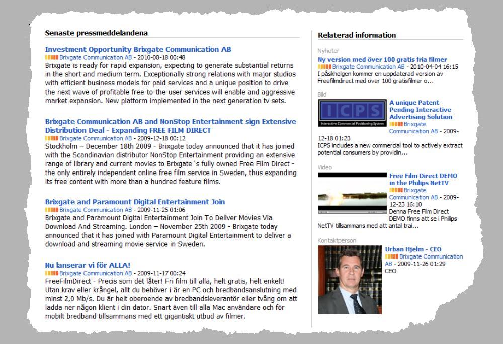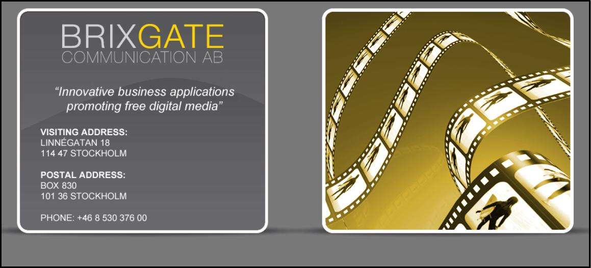 Brixgate Communication AB has developed a unique and pioneering solution for offering free to the end-user on-demand viewing of films in high quality over the Internet, based on Digital Rights Management and New Entertainment Business Models.