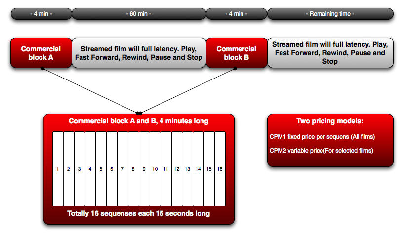 With the innovative new AVOD service, consumers with broadband internet connection can see attractive movies free at any time, and with only two short blocks of commercials, one before the start of the movie and one after 60 minutes. The streaming movie can be easily paused, forwarded and rewound, and seen as many times as desired. Each 4-minute commercial block will contain up to 16 short sequences.